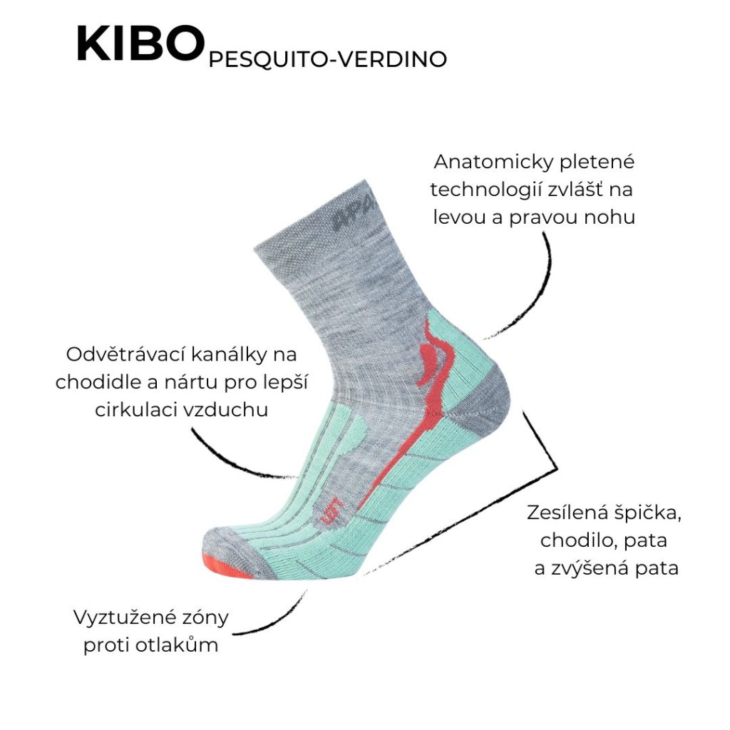 Celoroční ponožky KIBO s IONTY STŘÍBRA a MERINO VLNOU jsou mírně kompresní pro lepší krevní oběh v nohách. Mají protiskluzový streč kolem nártu a chodidla, který udržuje ponožku pevně na noze i při delší chůzi. Ze stejného důvodu jsou ponožky pletené zvlášť na pravou a levou nohu, díky čemu perfektně sedí. Ponožky KIBO mají zesílené chodidlo, patu i špičku pro měkčí došlap a proti oděru.