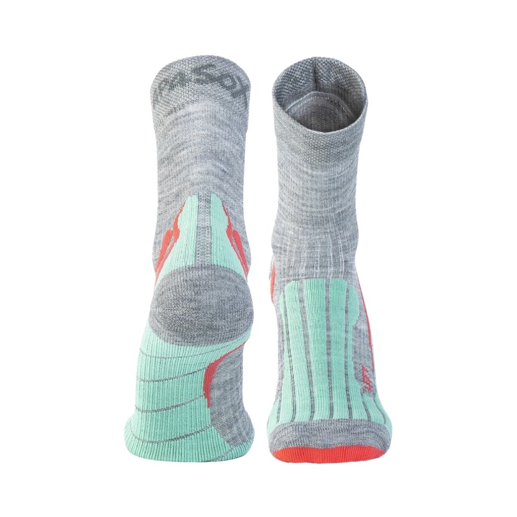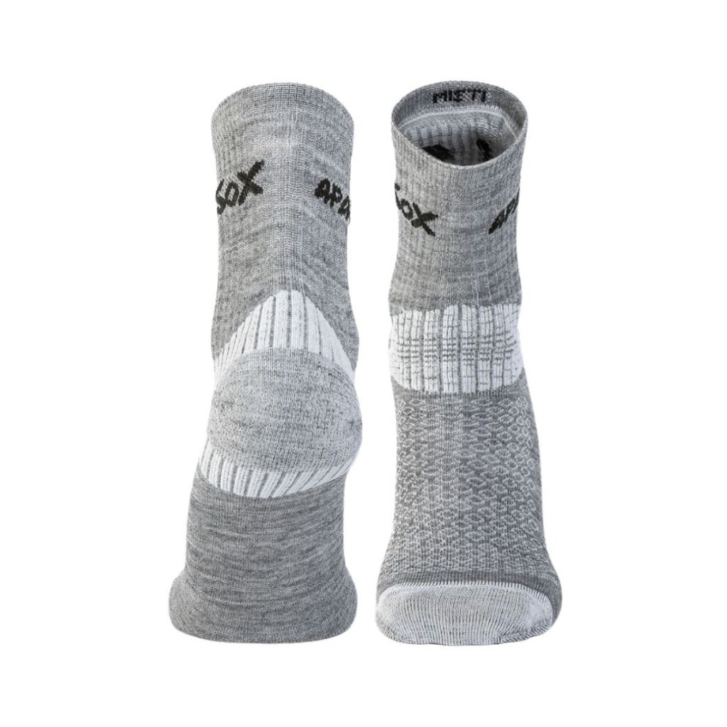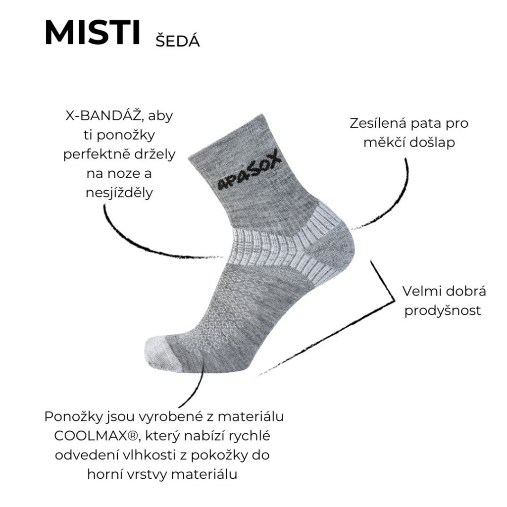 Letní ponožky střední délky z materiálu COOLMAX ALL SEASON® - MISTI šedé obohacené o MERINO vlnu skvěle odvádí vlhkost a díky tomu jsou odolné proti zápachu. Ponožky mají zesílenou špičku, zvýšenou a zesílenou patu pro měkčí došlap a X‐BANDÁŽ kolem kotníku a paty pro pevné držení.