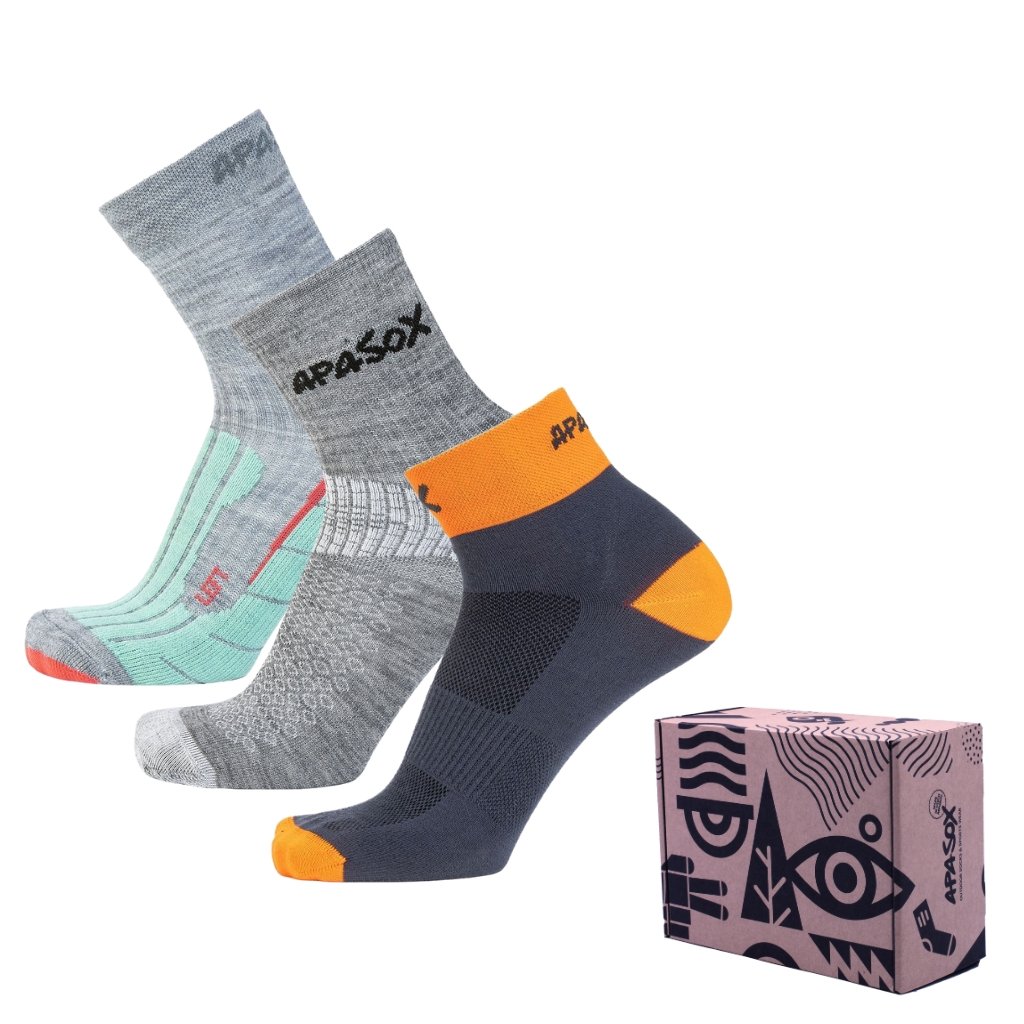 V dárkovém balíčku BIKING najdeš 3 páry ponožek, které jsou vhodné na cyklistiku - KIBO šedá, MISTI šedá a BIKERS oranžová.