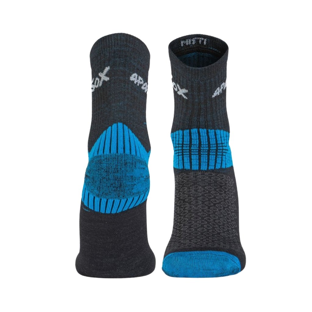 Letní ponožky střední délky z materiálu COOLMAX ALL SEASON® - MISTI modré obohacené o MERINO vlnu skvěle odvádí vlhkost a díky tomu jsou odolné proti zápachu. Ponožky mají zesílenou špičku, zvýšenou a zesílenou patu pro měkčí došlap a X‐BANDÁŽ kolem kotníku a paty pro pevné držení.