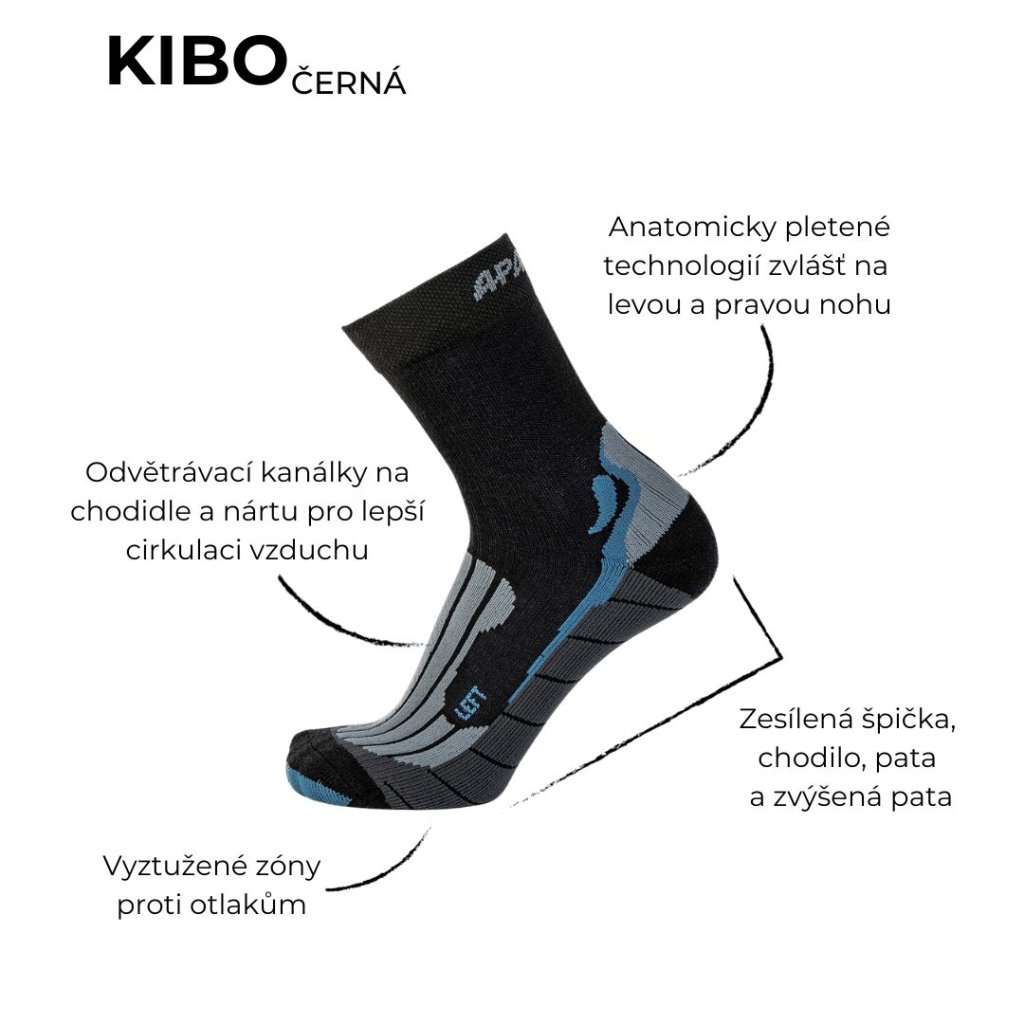Celoroční ponožky KIBO s IONTY STŘÍBRA a MERINO VLNOU jsou mírně kompresní pro lepší krevní oběh v nohách. Mají protiskluzový streč kolem nártu a chodidla, zásluhou toho ponožka pevně sedí na noze. Ze stejného důvodu jsou ponožky pletené zvlášť na pravou a levou nohu, díky tomu fakt perfektně sedí na nohách. Ponožky KIBO mají zesílené chodidlo, patu