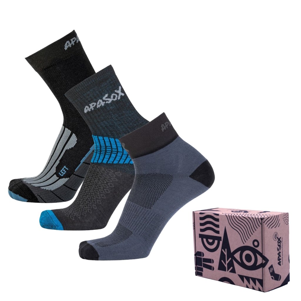 V dárkovém balíčku BIKING najdeš 3 páry ponožek, které jsou vhodné na cyklistiku - KIBO šedá, MISTI šedá a BIKERS oranžová.