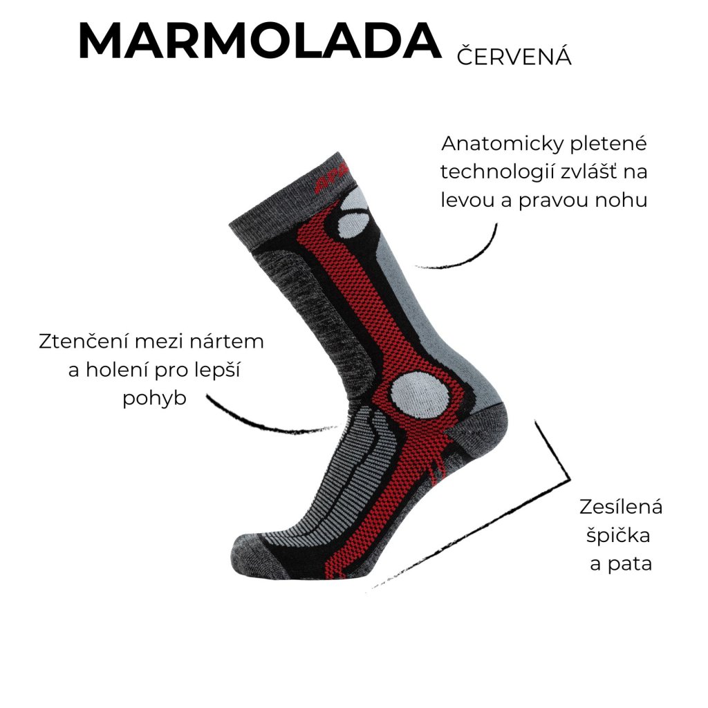 Tyhle ponožky i podkolenky vřele doporučujeme na turistiku v chladném počasí, na hory, na lyže, na snowboard, nebo třeba do ledních bruslí. A jak už název napovídá, klidně v nich můžeš vyrazit i do italských Dolomit. Ponožky MARMOLADA tě určitě nezklamou. Nabídnout ti je můžeme ve dvou různých barvách – červená a zelená.