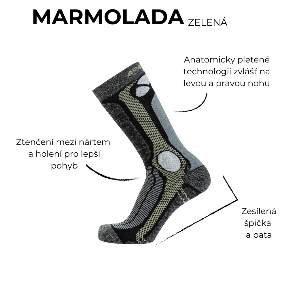 Zimní ponožky MARMOLADA a podkolenky MARMOLADA P jsou vyrobeny z MERINO VLNY a PROLEN® SILTEX, BODYFRESH. Jednoduše řečeno ponožky MARMOLADA a podkolenky MARMOLADA P jsou vyrobeny s ionty stříbra, no a tahle kombinace nabízí trvalé antibakteriální vlastnosti a odolnost proti zápachu. No není to super?