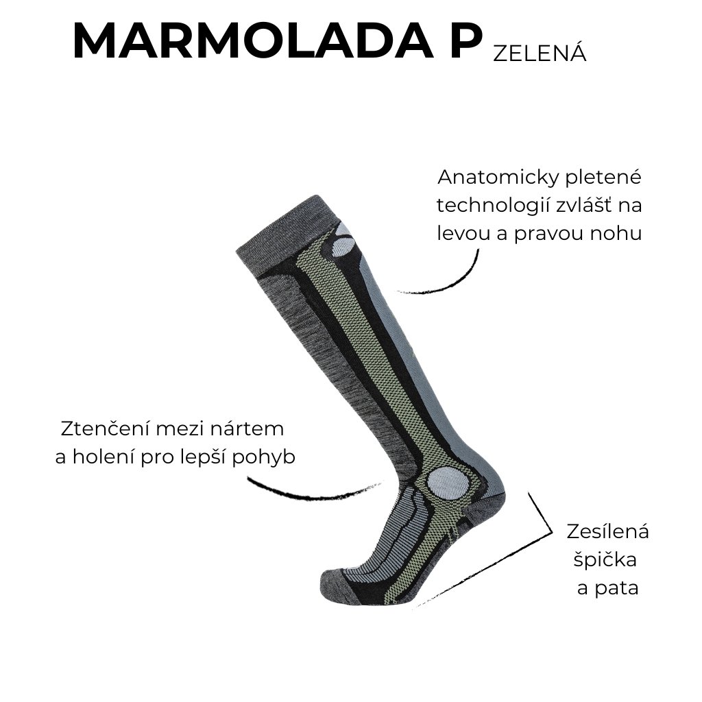 Tyhle ponožky i podkolenky vřele doporučujeme na turistiku v chladném počasí, na hory, na lyže, na snowboard, nebo třeba do ledních bruslí. A jak už název napovídá, klidně v nich můžeš vyrazit i do italských Dolomit. Ponožky MARMOLADA tě určitě nezklamou. Nabídnout ti je můžeme ve dvou různých barvách – červená a zelená.
