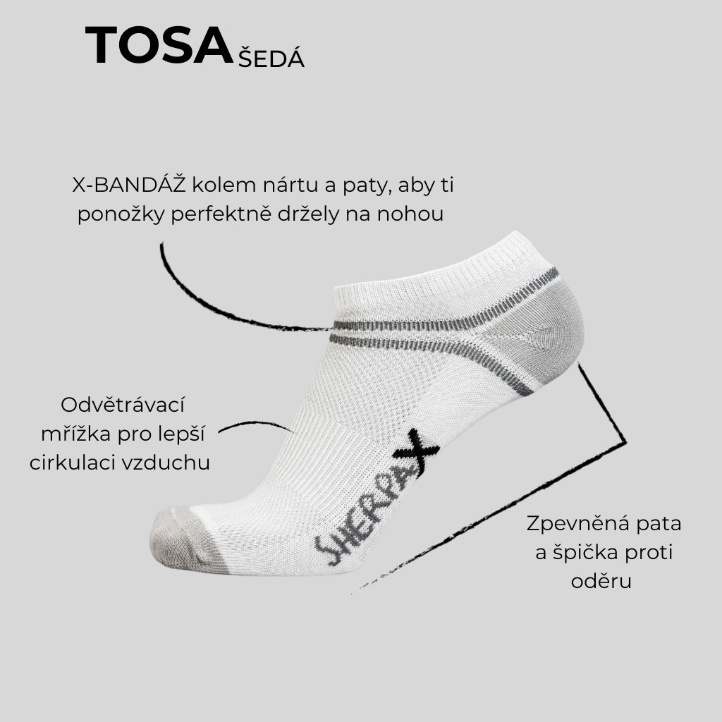 Ponožky TOSA jsou odolné proti oděru v botách, a to díky zpevněné patě a špičce. Ponožky mají kolem nártu protiskluzový streč, který zajišťuje, aby ponožky dobře držely na svém místě. Navíc jsou ponožky TOSA nesmírně prodyšné díky odvětrávací mřížce, která se táhne po celém nártu.