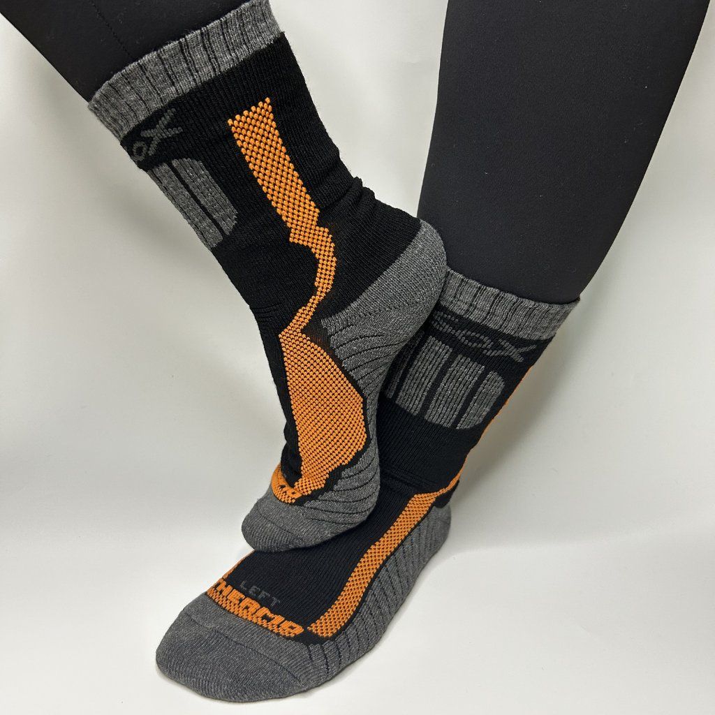 DOM mají zpevněnou holenní část, protiskluzový streč kolem nártu a přes chodidlo, takže se v botě nehýbou ani při delší chůzi. Zesílená špička, celé chodidlo a zvýšená pata tlumí došlap, chrání namáhaná místa a prodlužují životnost ponožek i při pořádné zátěži.