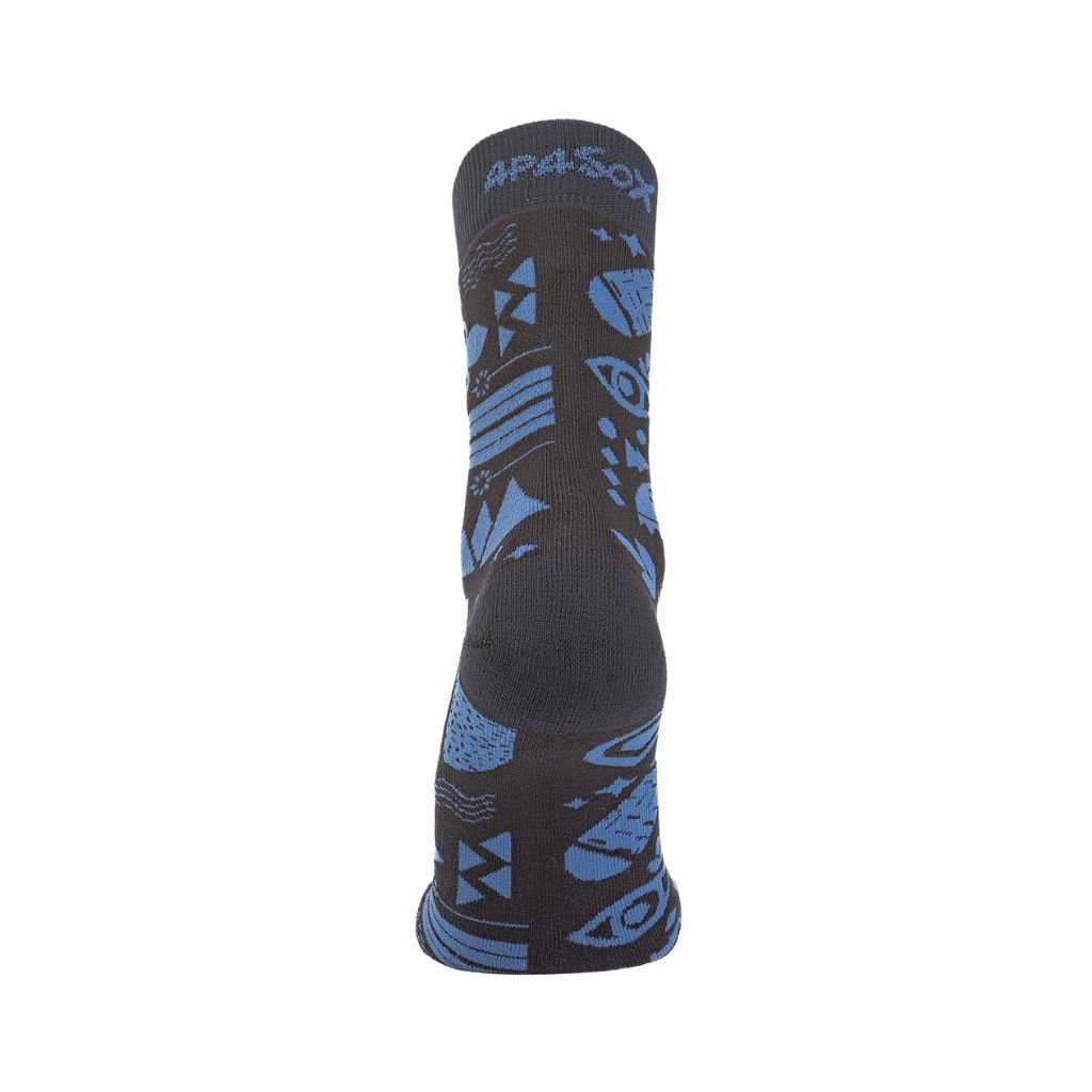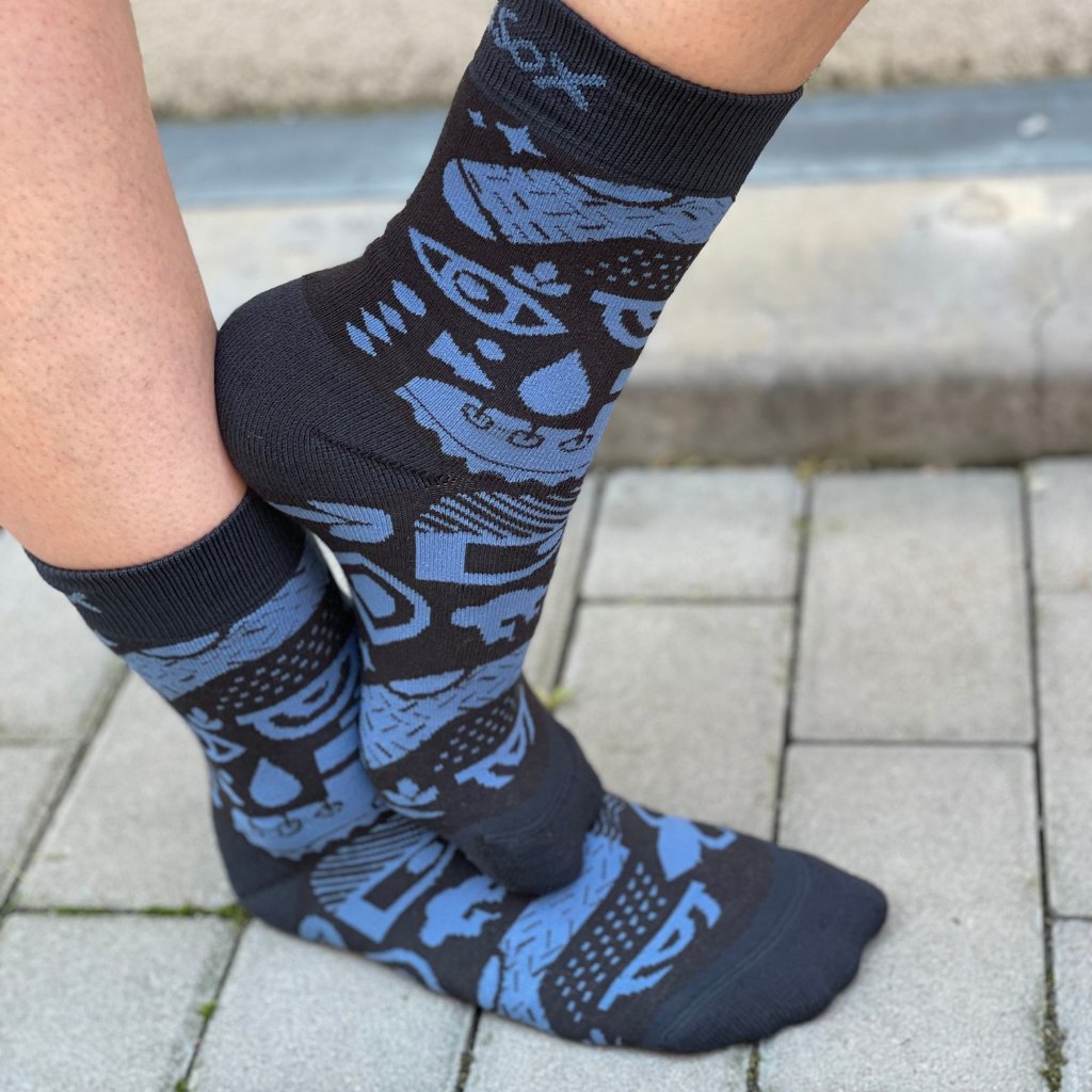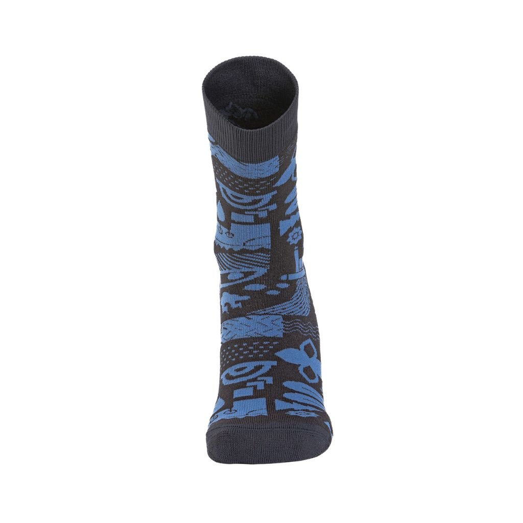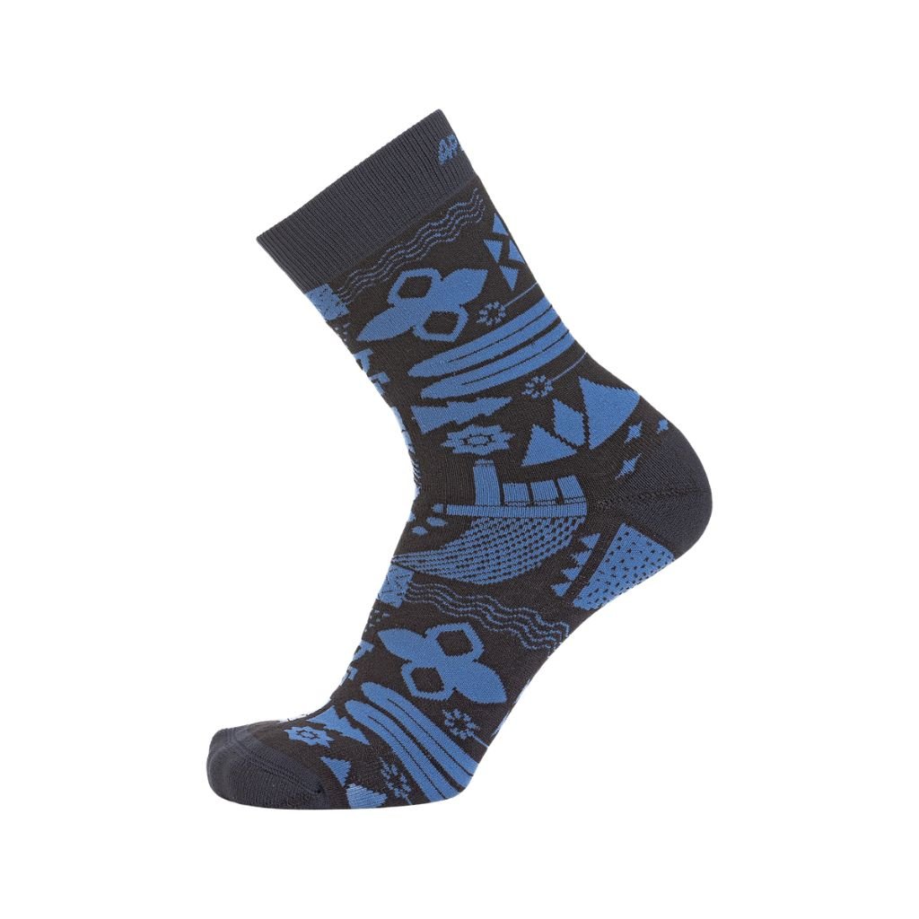 Design ponožky je vykreslen různými znaky. Na antracitovém podkladě jsou modré symboly, které zachycují nejrůznější sportovní tématiku od hor až po sportovní náčiní.