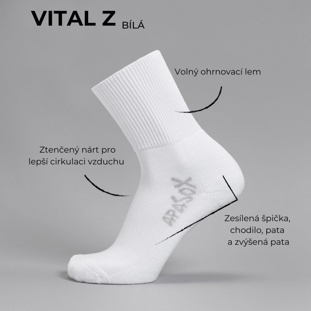 Specifickým znakem ponožek je volný lem, který můžete ohrnout. VITAL jsou volné také na nártu i kolem kotníku, takže nikde netahají.