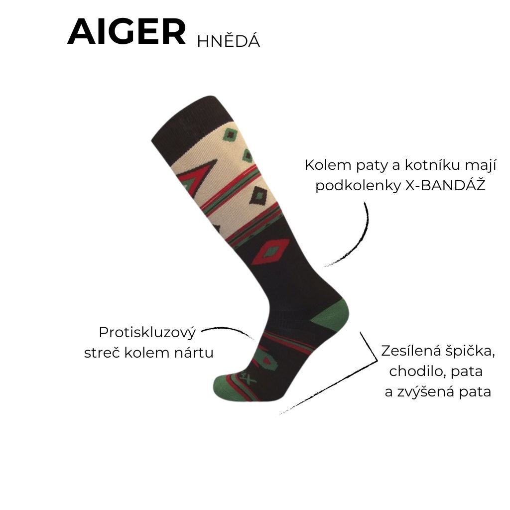 My je vřele doporučujeme do chladnějšího počasí či přímo v zimním období, protože jsou celé zateplené plyšovou vazbou. Podkolenky AIGER mají protiskluzový streč kolem nártu. Kolem paty a kotníku mají podkolenky X-BANDÁŽ, díky tomu podkolenky perfektně sedí na nohách.