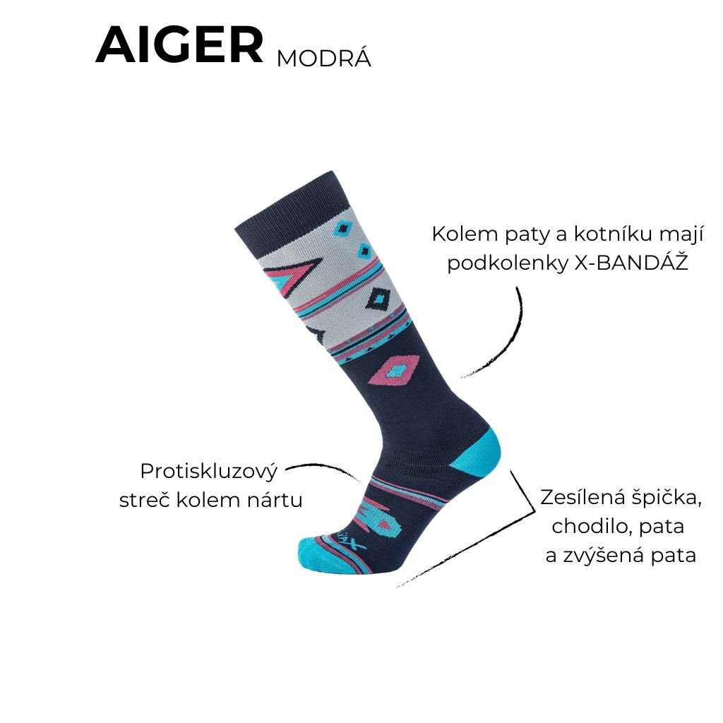 My je vřele doporučujeme do chladnějšího počasí či přímo v zimním období, protože jsou celé zateplené plyšovou vazbou. Podkolenky AIGER mají protiskluzový streč kolem nártu. Kolem paty a kotníku mají podkolenky X-BANDÁŽ, díky tomu podkolenky perfektně sedí na nohách.