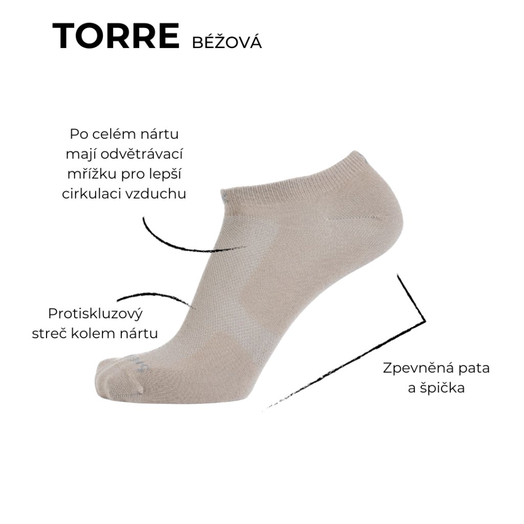 Nízké podkotníkové ponožky TORRE jsou velmi tenké a lehké, takže téměř necítíš, že je máš na sobě. Díky protiskluzovému streči kolem nártu perfektně drží na noze a nesjíždějí ani při pohybu.
