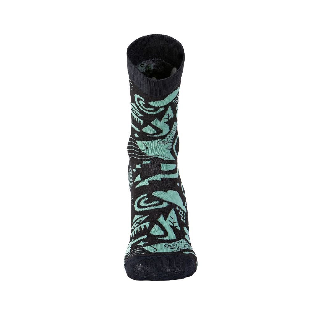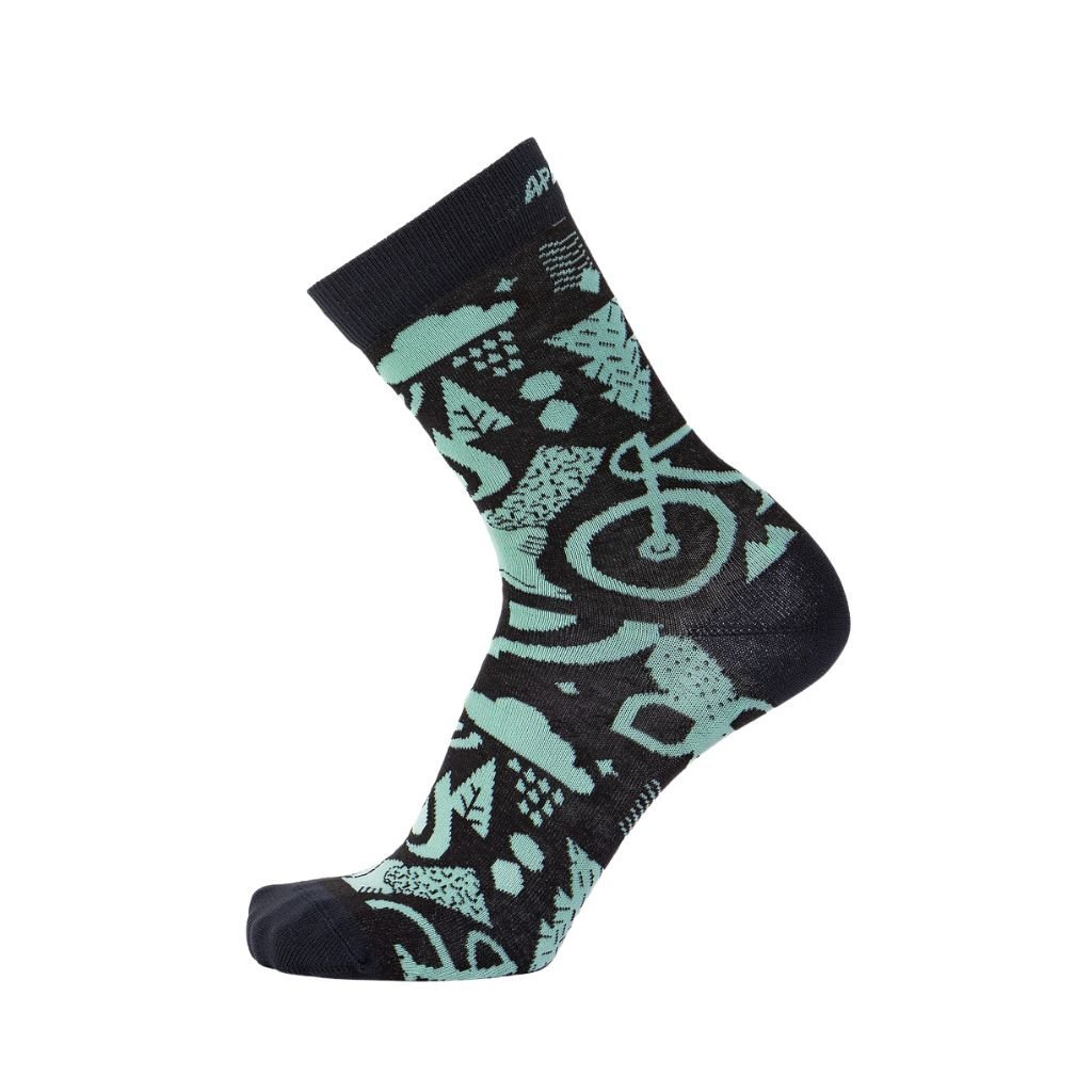 Design ponožky je vykreslen různými znaky. Na antracitovém podkladě jsou zelené symboly, které zachycují nejrůznější sportovní tématiku od hor až po sportovní náčiní.