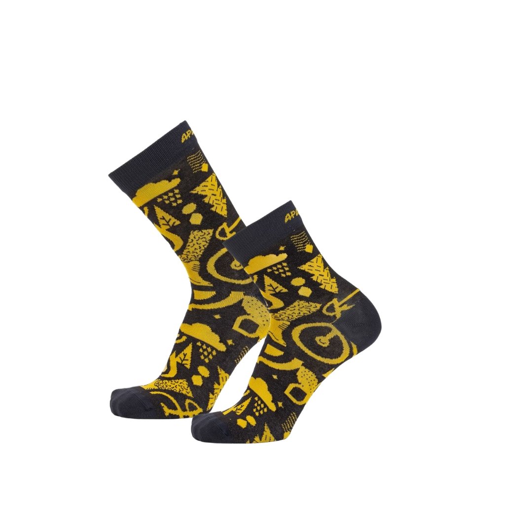 Design ponožky je vykreslen různými znaky. Na antracitovém podkladě jsou žluté symboly, které zachycují nejrůznější sportovní tématiku od hor až po sportovní náčiní.