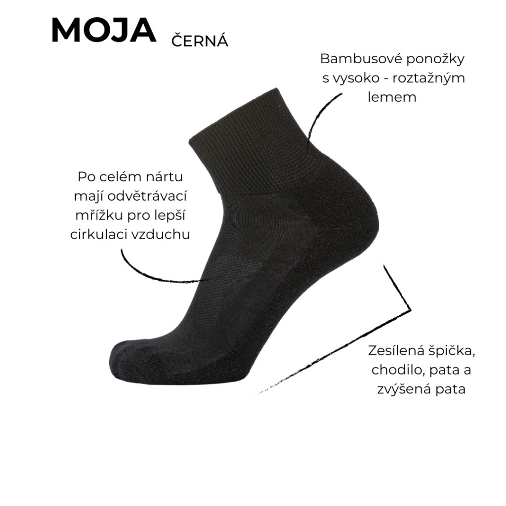Materiálově jsou ponožky stejné jako klasické MOJA – letní bambusové, lehké, prodyšné a skvěle sající vlhkost. Mají zvýšenou patu pro ochranu achilovky, odvětrávací mřížku na nártu a zesílené chodidlo pro vyšší odolnost.