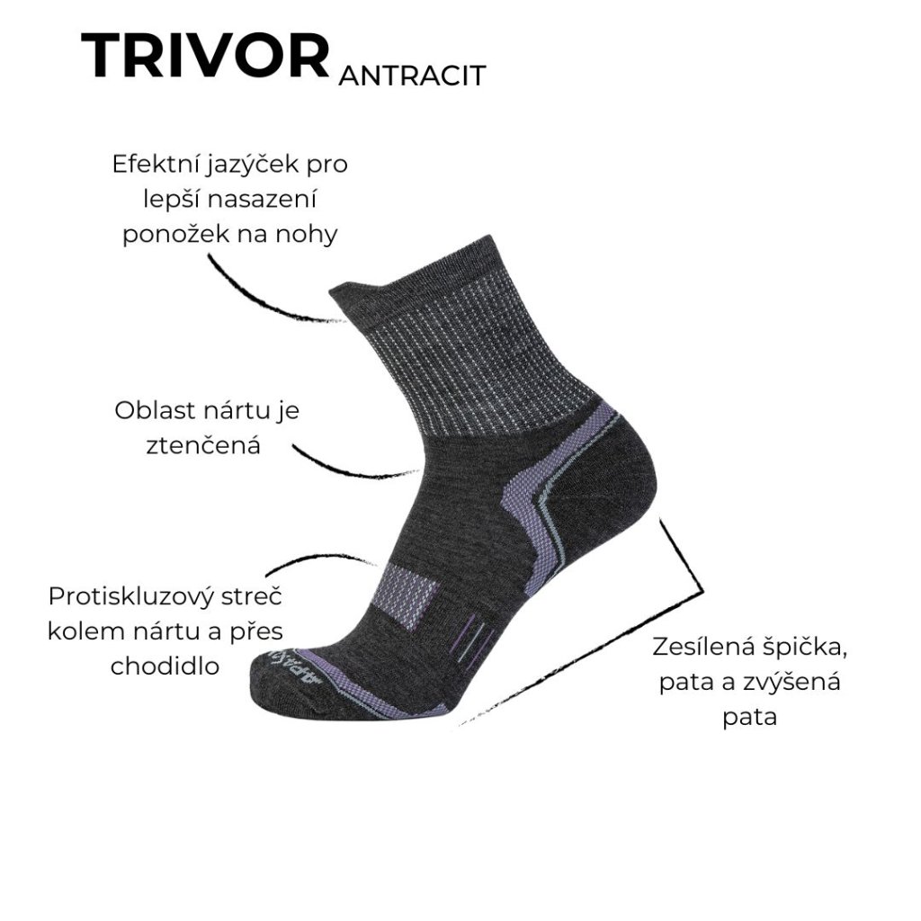 Ponožky TRIVOR jsou odolné proti zápachu a mají vysokou pružnost a pevnost. Kolem nártu mají ponožky protiskluzový streč, aby ti nesjížděly z nohou. Mají zesílenou a zpevněnou patu a špičku pro měkčí došlap a vyšší odolnost proti oděru. V oblasti nártu jsou ponožky ztenčené, což zvyšuje jejich prodyšnost. Holenní a lýtková část je ztenčená a vpředu mají ponožky jazýček pro lepší nasazení na nohy.